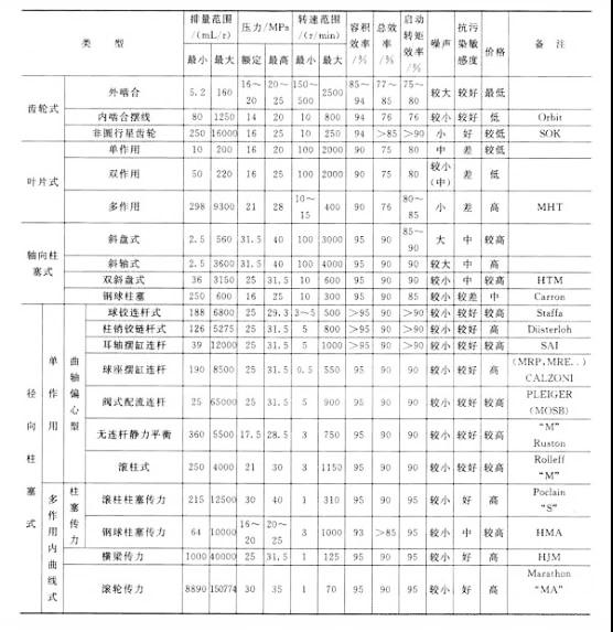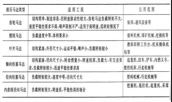 ①液壓馬達(dá)的種類較多,特性不同,應(yīng)針對(duì)具體用途及其工況,參照下表選擇合適的液壓馬達(dá)。