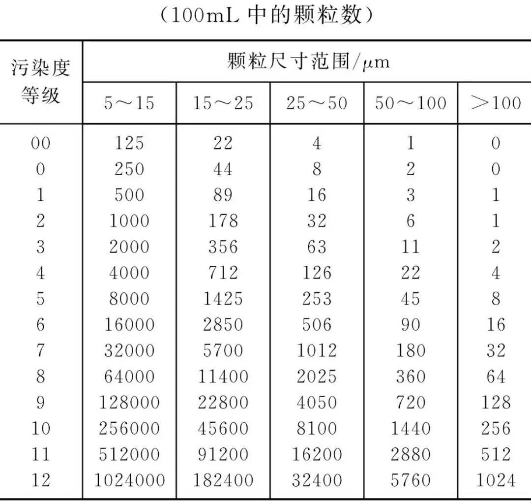 例如污染度等級(jí)18/13表示油液中大于5μm的顆粒數(shù)等級(jí)為18,每毫升顆粒數(shù)為1300~2500;大于15μm的顆粒數(shù)等級(jí)為13,每毫升顆粒數(shù)為40~80。