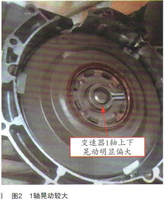 按照一般的診斷,油封很少會(huì)出現(xiàn)老化漏油的情況,漏油一般是由于密封元件徑向跳動(dòng)過(guò)大,內(nèi)部氣壓或油壓過(guò)高或過(guò)低造成的油封唇口變形所導(dǎo)致。上下晃動(dòng)變速器輸入軸,發(fā)現(xiàn)1軸晃動(dòng)量比較大,如圖2所示。