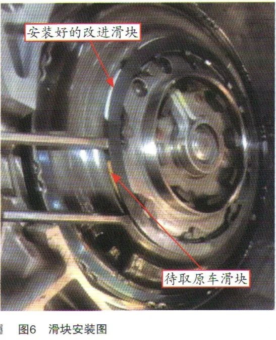 改進(jìn)后的滑塊明顯變長(zhǎng)變厚,如圖5所示。安裝圖如圖6所示。