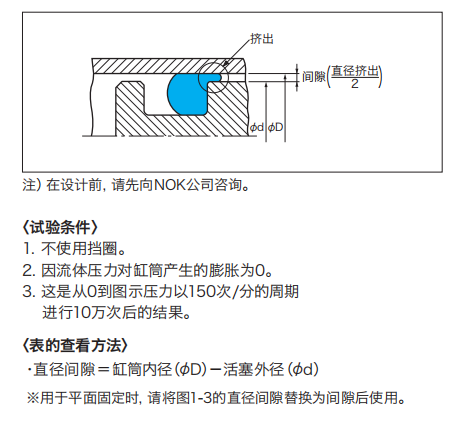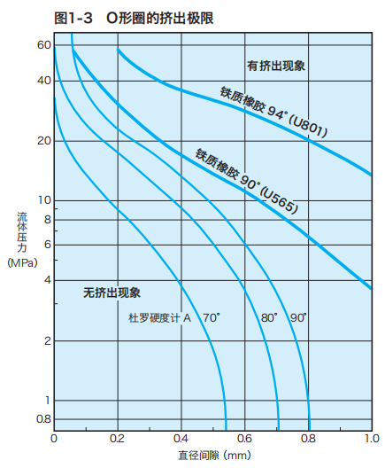 擠出由流體的壓力和間隙及橡膠的硬度決定。其關(guān)系如圖1-3所示,請參考。(該值的前提是沒有因壓產(chǎn)生的溝槽變形的情況。若擔(dān)心受壓力使密封面發(fā)生變形,則請將間隙的值設(shè)計(jì)為75%左右。)