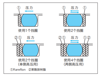 從圖1-3來看,壓力或間隙也超出極限時,請使用擋圈。從兩個方向施加壓力時,將擋圈安裝于O形圈的兩側(cè),從一個向施加壓力時,安裝于施加壓力的相反側(cè)。
