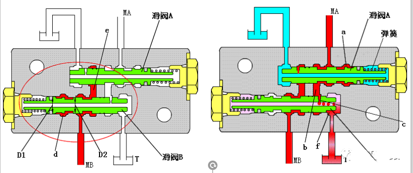 停止回轉(zhuǎn)時(shí),油口MB產(chǎn)生閉合壓力,壓力油進(jìn)入油腔d,滑閥B按照D1>D2的面積差克服彈簧力向左移動(dòng),MB壓力進(jìn)入油腔e,壓力油被滑閥A關(guān)閉,因此產(chǎn)生液壓制動(dòng);