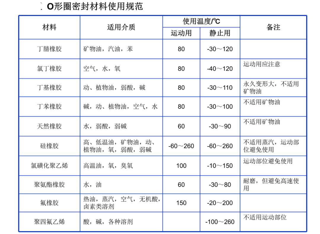 一般來說耐油用丁睛橡膠,耐天候和臭氧用氯丁橡膠,耐熱用丙烯酸酷橡膠或氟橡膠,耐高壓、耐磨用聚氨酷橡膠,耐寒同時又耐油用共聚氯醇橡膠等各種膠料的適用范圍詳見下表。