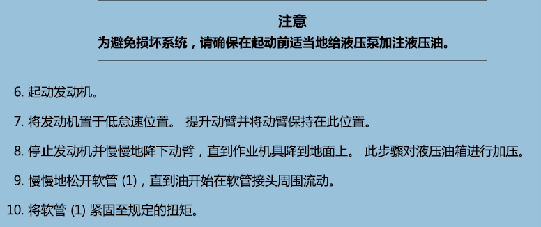完成主泵維修或液壓油更換后,請排除液壓系統(tǒng)中的空氣。 用下述方式可以排除: