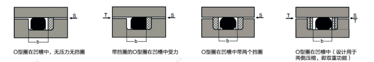 如果壓力超過50bar(5MPa),則應在O型圈上的基礎上加一個擋圈,并將間隙縮小到接近0毫米。