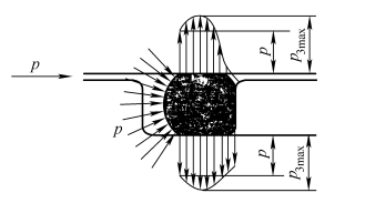 由于預密封作用,O形圈與被密封光滑面和溝槽底面緊密接觸,這樣當流體通過間隙進入溝槽時,只能對O形圈的一側面起作用。在工作狀態(tài)下,流體通過間隙加到O形圈一側的內壓力進一步加大時,把O形圈推向溝槽另一側面而擠壓變形成D形狀態(tài),并把這種壓力傳遞到密封接觸表面。因此,由于最初的過盈壓力作用,密封壓力實際上大于所施加的流體壓力。O形圈工作狀態(tài)下接觸面的壓力分布如圖3所示。