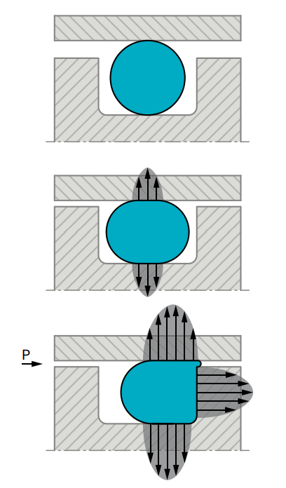 O形圈是一種雙向密封元件。安裝時(shí),O形圈徑向或軸向的初始壓縮量決定了O形圈的初始密封能力。系統(tǒng)壓力作用于O形圈所 產(chǎn)生的力,就是其總的密封力;該密封力隨著系統(tǒng)壓力的升高 而增大。在壓力作用下,O形圈的形狀和具有高表面張力的液體相仿,壓力朝各個(gè)方向等值傳遞。