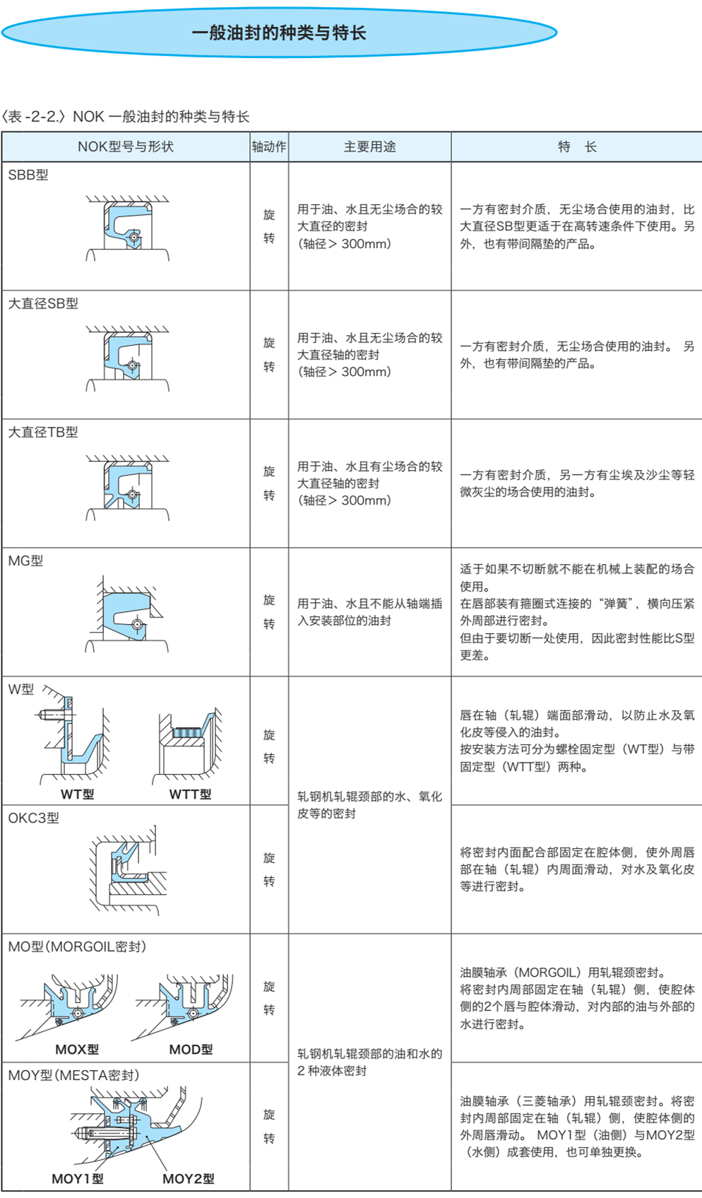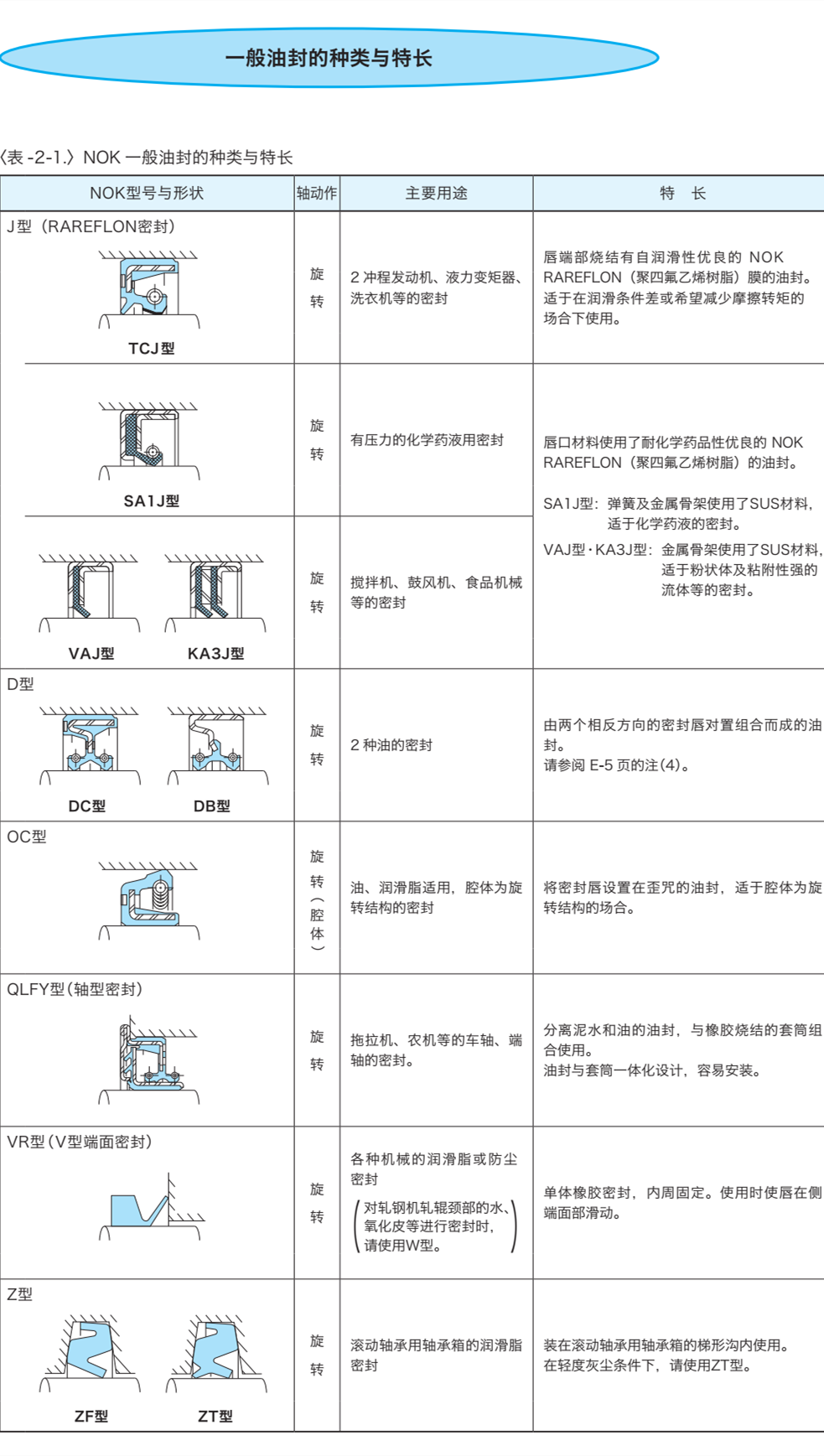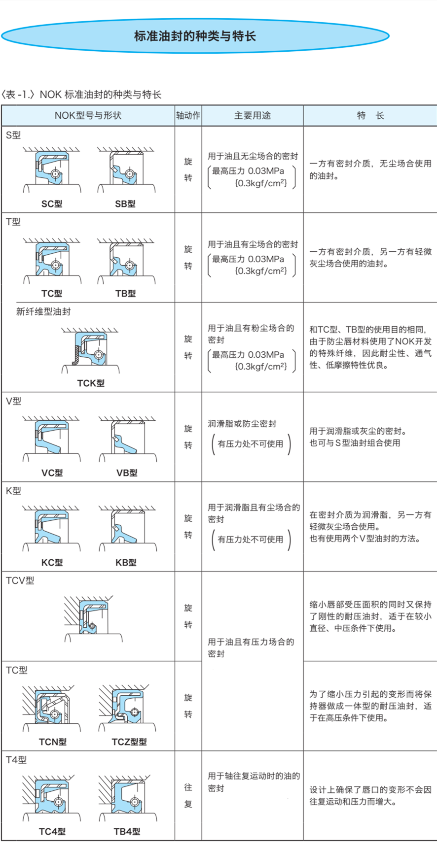 ,顧名思義,即封油用的機(jī)械元件。為了充分發(fā)揮油封的功能,必須選擇最適使用條件的型號和材料。油封選擇的要素有兩個:①.材料;②.工作壓力。可參照如下兩個表格所列的油封種類和特長進(jìn)行正確選擇。