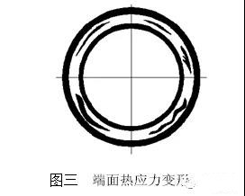 3.熱變形(見圖三) 密封面上有對稱不連續(xù)的亮帶,這是由于熱變形引起的。有時,這種狀態(tài)觀察不出來,只有在端面上涂以紅丹粉,通過與平面輕輕研磨才能發(fā)現(xiàn)。出現(xiàn)這種情況,主要是由于不規(guī)則的冷卻,引起密封面的熱應(yīng)力變形。