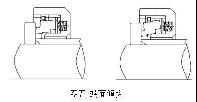 5.端面偏斜(見圖五) 表征為密封面磨損不均勻,造成密封面中凸或中凹,在介質(zhì)變壓力工況下,表現(xiàn)為密封性能不穩(wěn)定;能使密封面摩擦轉(zhuǎn)矩增大,并產(chǎn)生大量的摩擦熱。產(chǎn)生端面偏斜的原因有:工作壓力超過許用值,或液力平衡選取不當?shù)取?/span>