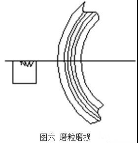 6.磨粒磨損(見圖6) 磨粒磨損通常是由于嵌入軟環(huán)內(nèi)或附夾在端面間的顆粒所引起的。后者比前者引起的磨損小。前者磨損往往出現(xiàn)在硬環(huán)端面上,呈圓周溝槽且同心分布。圖中的碳化鎢硬質(zhì)合金的磨損痕跡即位一例。