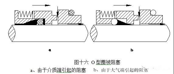 16.O型圈處被阻塞(圖十六)在密封介質(zhì)的一側(cè),由于固體物料比率高或纖維物料多,補償環(huán)作浮動調(diào)整時,固體物或雜質(zhì)進入期間,產(chǎn)生阻塞,補償環(huán)不能作軸向滑移和浮動調(diào)整;在大氣一側(cè),由于液膜蒸發(fā)、冷凝沉積、分離蒸餾,引起濃縮物的堆積、也能阻塞O型圈正?;坪驼{(diào)整,從而使密封端面不能接觸而產(chǎn)生泄漏。