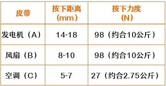 檢查發(fā)動機(jī)皮帶松緊度,首先關(guān)閉發(fā)動機(jī),然后用大拇指按下皮帶的中部,其距離如果在以下表范圍內(nèi)則屬正常(1N=0.102KG)。張力不足時,皮帶易打滑。張力過大時,易損傷各軸承。