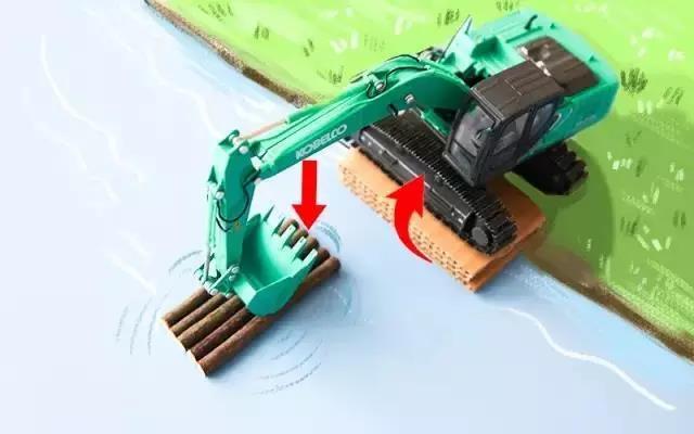雙側(cè)陷落時:雙側(cè)履帶陷落且不能移動時,在履帶板下鋪設(shè)木料或者圓木,然后將挖斗插入前方圖層中,按照與挖掘相同的要領(lǐng)彎曲小臂,再將行走操作桿置于前進(jìn)側(cè),將機(jī)身拉出。
