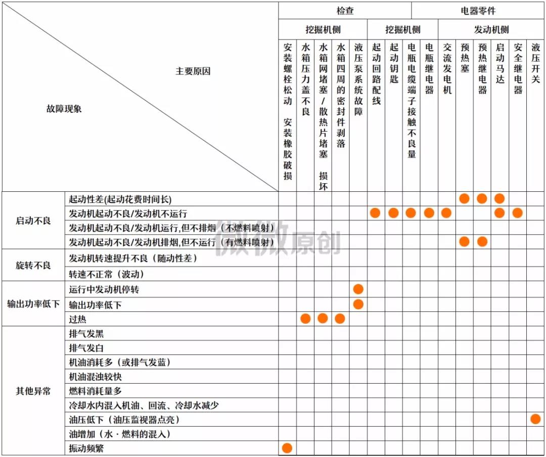 啟動(dòng)不良:起動(dòng)性差(起動(dòng)花費(fèi)時(shí)間長) ;發(fā)動(dòng)機(jī)起動(dòng)不良/發(fā)動(dòng)機(jī)不運(yùn)行 ;發(fā)動(dòng)機(jī)起動(dòng)不良/發(fā)動(dòng)機(jī)運(yùn)行,但不排煙(不燃料噴射) ;發(fā)動(dòng)機(jī)起動(dòng)不良/發(fā)動(dòng)機(jī)排煙,但不運(yùn)行(有燃料噴射) ;